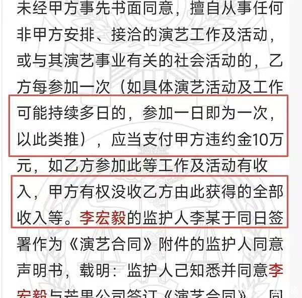 合约规定,未经芒果娱乐书面同意的私自接戏行为,全部收入需上交公司。 解约需按剩余合约年限赔偿,每年100万元,且私自接戏需额外支付违约金(如2019年一部戏判赔400万)。 李宏毅控诉公司未提供职业规划及资源(签约后两年无影视资源),且被雪藏期间仍受条款限制,导致其被迫接戏谋生却触发赔偿。